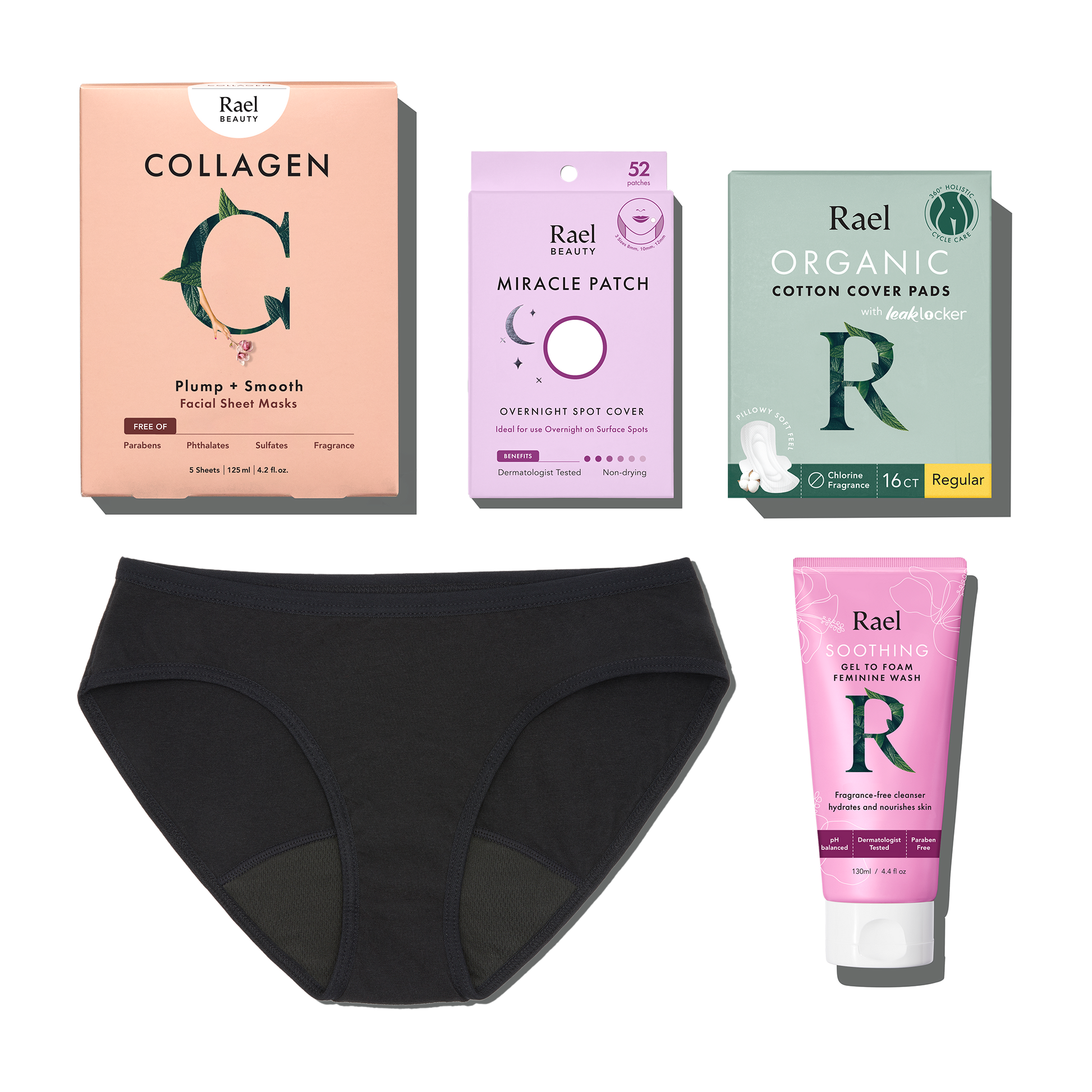 The Complete Cycle Sync Bundle is your holistic solution to look and feel your best during your period. Collagen Sheet Masks helps keep dry, irritable skin hydrated, while Overnight Spot Covers work their magic on hormonal acne while you sleep. Stay leak-free with bestselling Organic Cotton Cover Pads and Reusable Period Underwear. Use Gel-to-Foam Soothing Feminine Wash to feel fresh and calm sensitive skin.