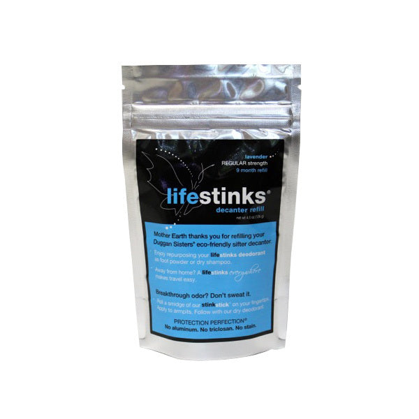Is it time to refill your eco-friendly sifter container? Make sure you have your original Duggan Sisters lifestinks decanter; it is 100% stainless steel with an ultra-fine mesh for smooth application. It is guaranteed to provide you with quality results by protecting your botanical-rich deodorant from light, cross-contamination and aluminum-laced containers.This Lavender Regular Strength Refill Bag contains a 9-month supply of lifestinks. Yep, that's right, $2 per month for the world's smartest and most effective deodorant. Be good to Mother Earth and your budget.Aluminum-free. Triclosan-free. Fragrance-free. Talc-free. Stain-free.