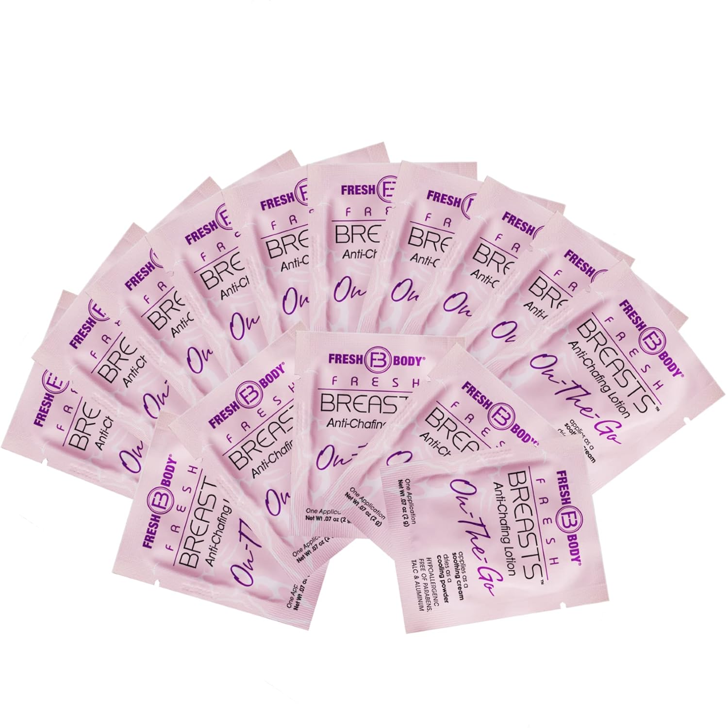Includes: (60) 0.07 oz Travel Size Packets of Fresh Breasts On-The-Go Anti-Chafing Lotion - Soothing Deodorant Lotion for Women - Single Use Trial Size Packet | Fragrance-free, Aluminum-Free, Paraben-Free, and Talc-Free. Hypoallergenic. Not Tested on Animals Just Humans.